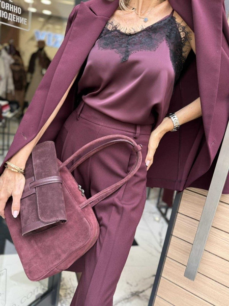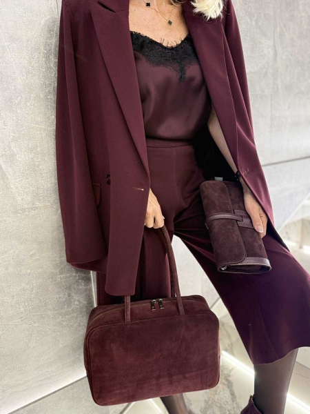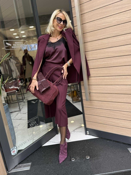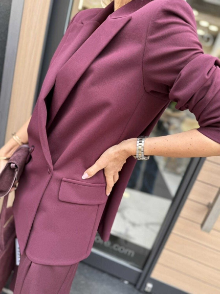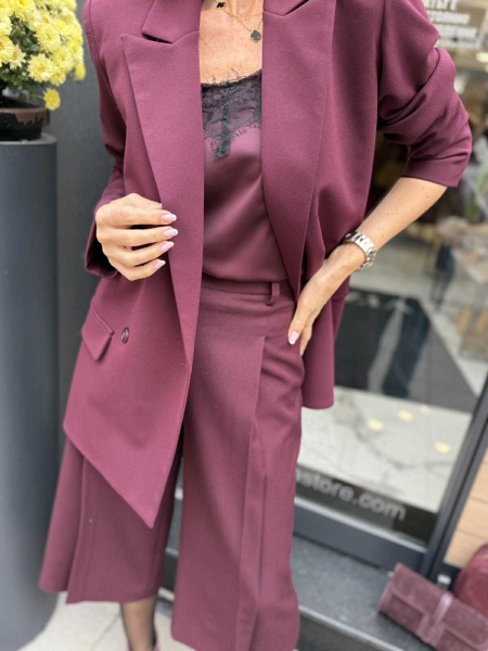 Комплект сако и панталон в цвят бордо. Сакото е oversize модел с ревери и копчета. Панталонът е с ръбове, 7/8 дължина и разкроени и широки крачоли.