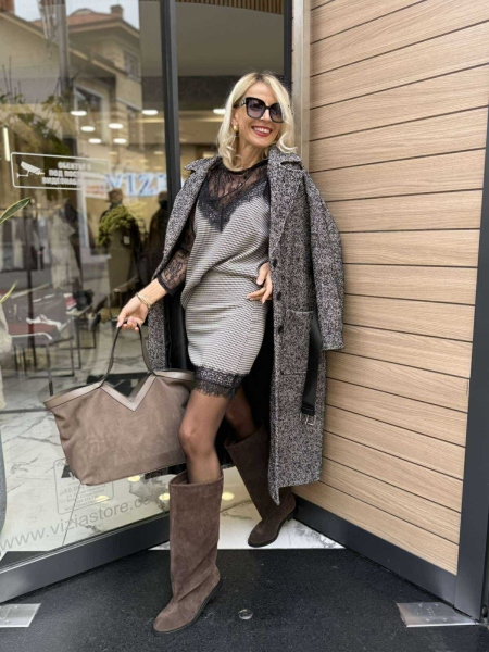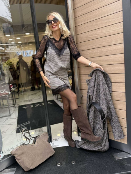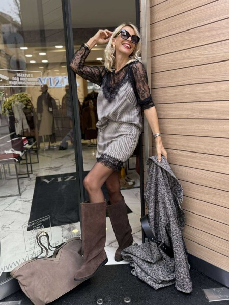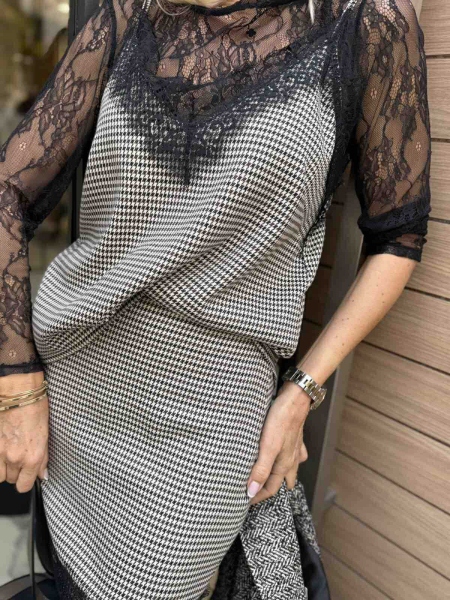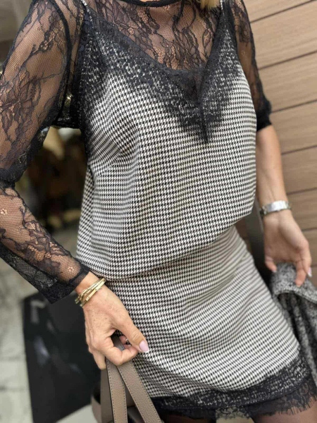 Комплект от три части с черна дантела и каре десен. Топ с тънки презрамки и свободна кройка. Блуза изцяло от дантела със свободна кройка. Къса пола по тялото с цип.