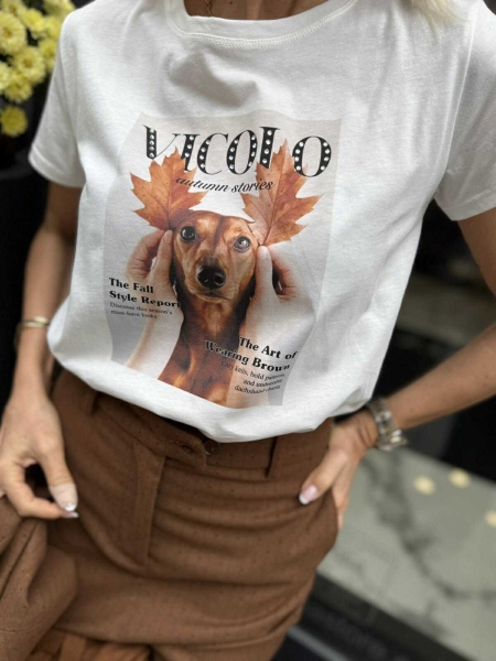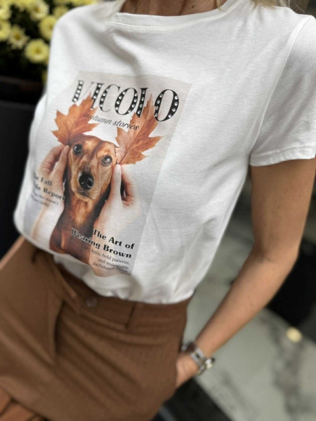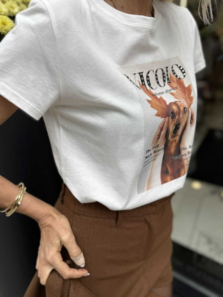 Тениска от трико в бял цвят с апликация в предната част. Моделът е със свободна кройка. Универсален размер.