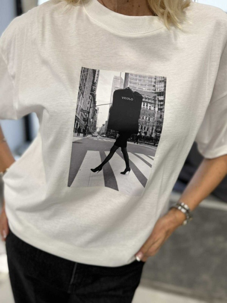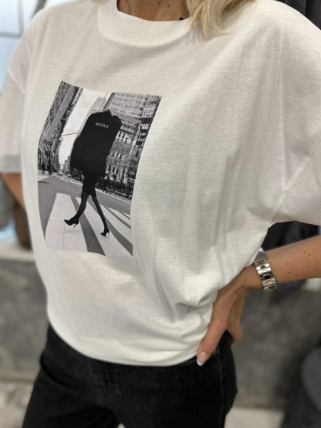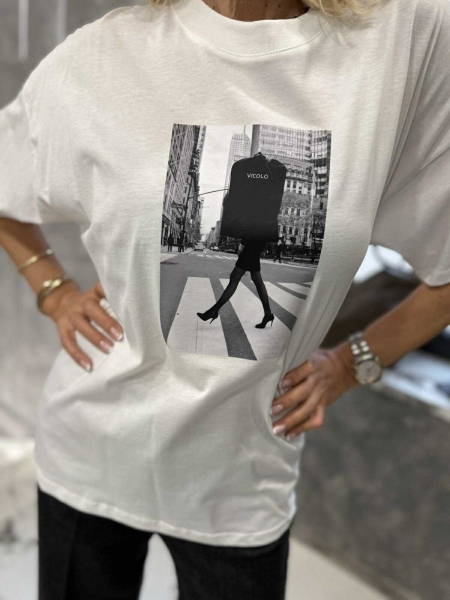 Тениска от трико в бял цвят с апликация в предната част. Моделът е със свободна кройка. Универсален размер.