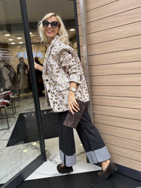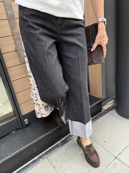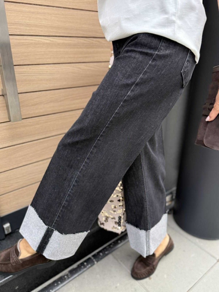 Дънки в тъмно синьо с широки крачоли с ръбове и висока талия.  Моделът е с голям обърнат маншет.