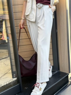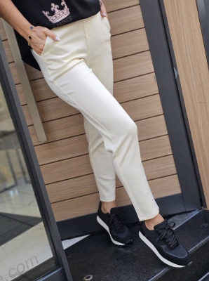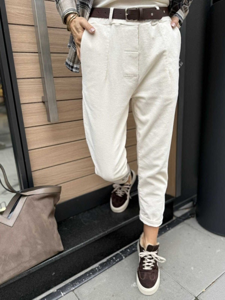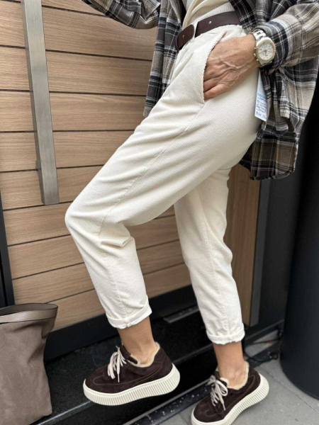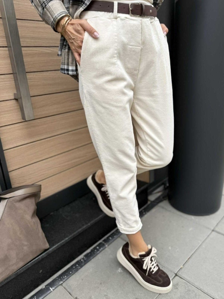 Джинси в цвят екрю със свободни крачоли и ластик на талията. Към тях има аксесоар колан.