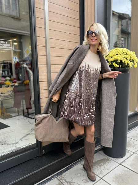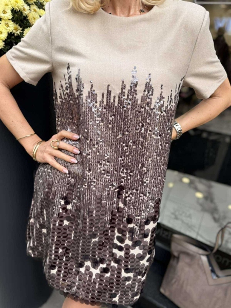Къса рокля със свободна кройка в бежов цвят с декорация от пайети. Моделът е с подплънки и се облича без закопчаване.