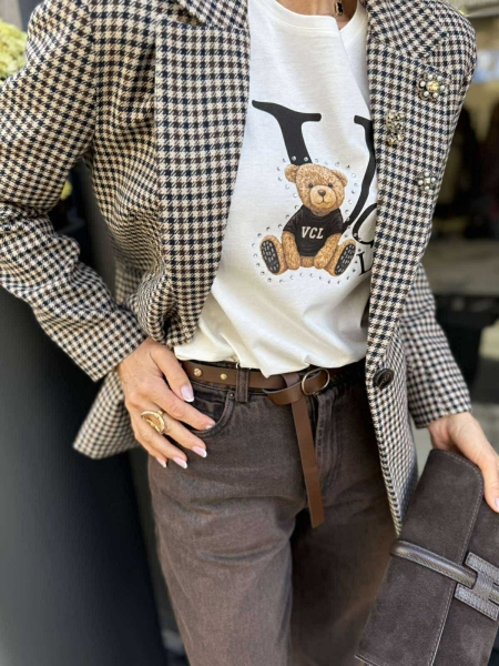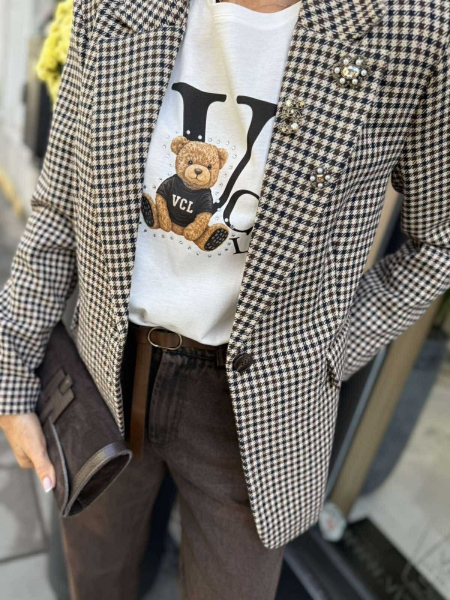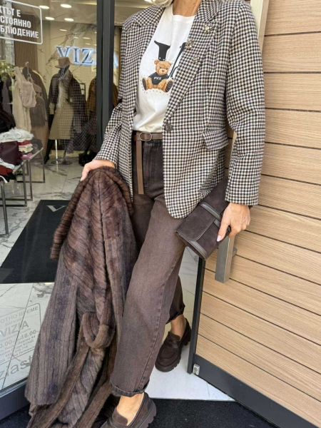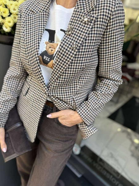 Сако от плътна материя с кариран десен. Моделът е с вталена кройка, ревери и закопчаване  с копче. Брошките се предлагат със сакото. Универсален размер.