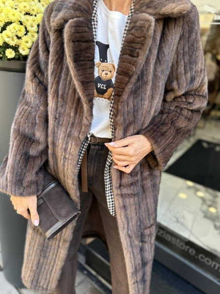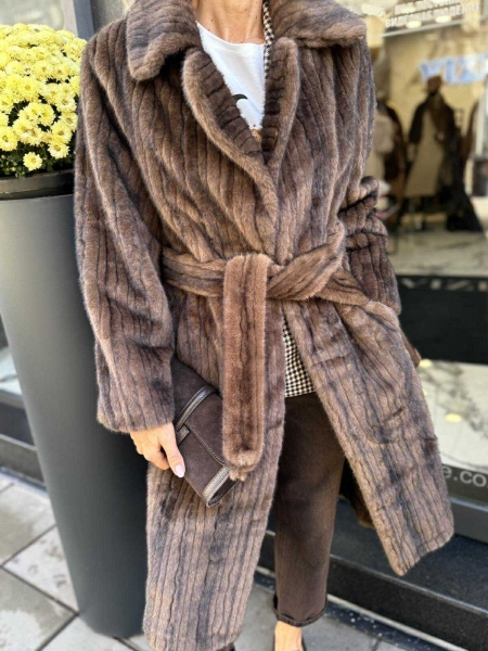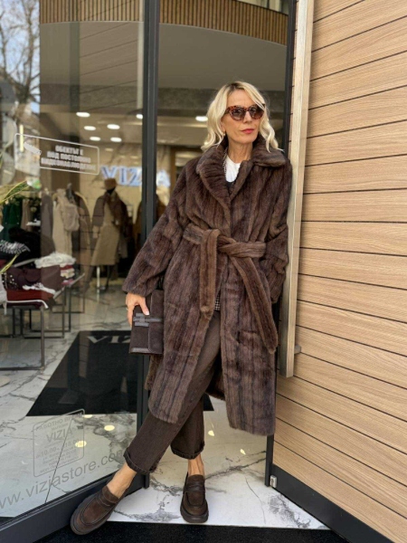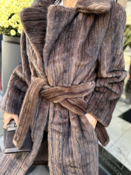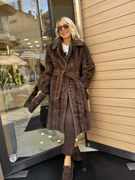 Палто в кафяв цвят от еко косъм с ревери и странични джобове. Към него има колан за прибиране. Универсален размер.
