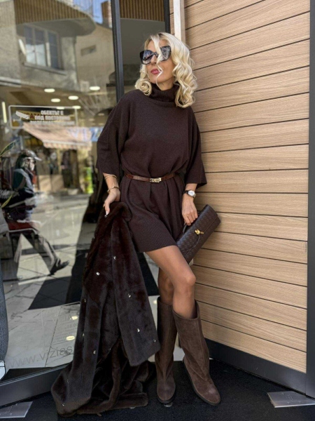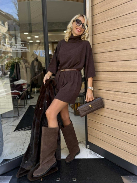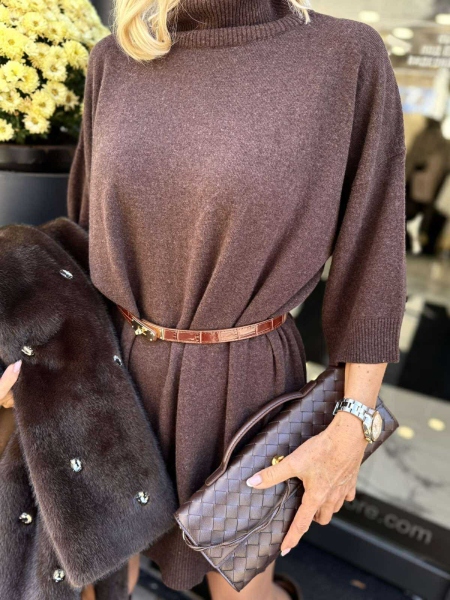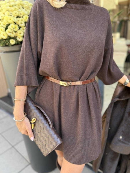 Рокля със свободна кройка от фино плетиво в кафяв цвят с поло яка и свободна кройка. Универсален размер.