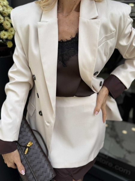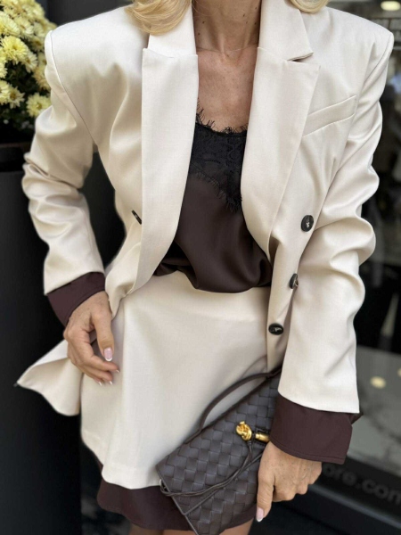 Комплект сако с къса пола в бежов цвят. Сакото е вталено с ревери и закопчаване с копчета. Полата е трапецовидна кройка с кафява декорация в долната част.