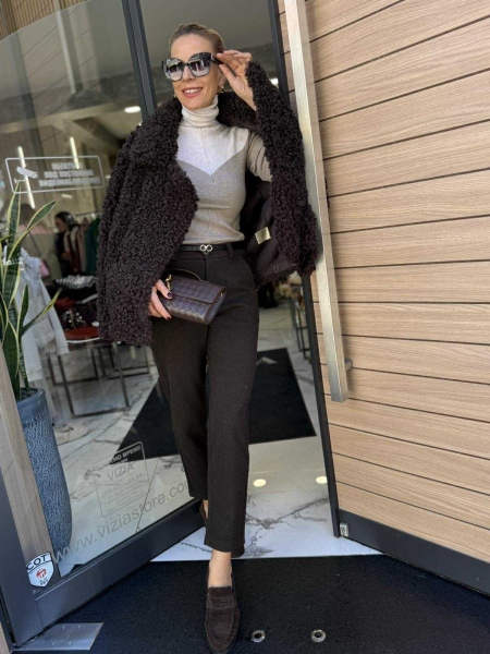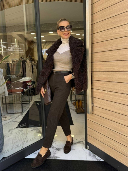 Късо палто от еко косъм в кафяв цвят с ревери и закопчаване с копчета. Моделът е със свободна кройка. Универсален размер.