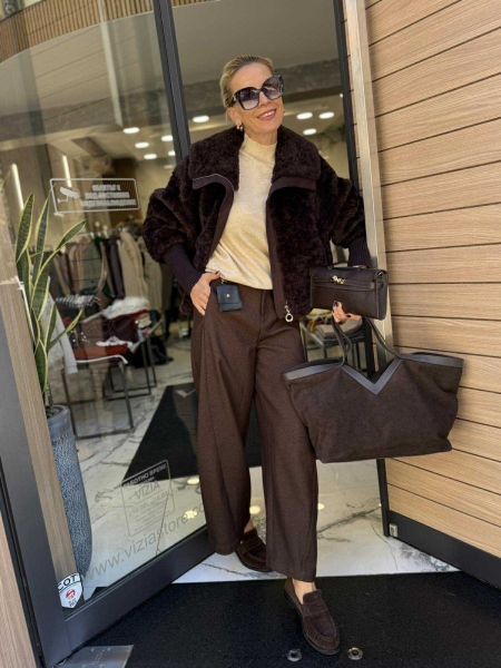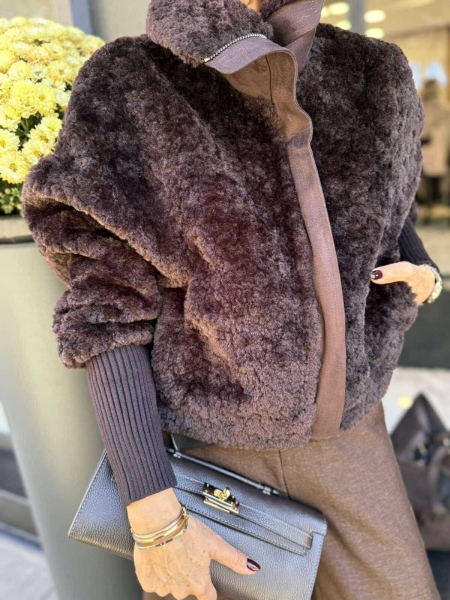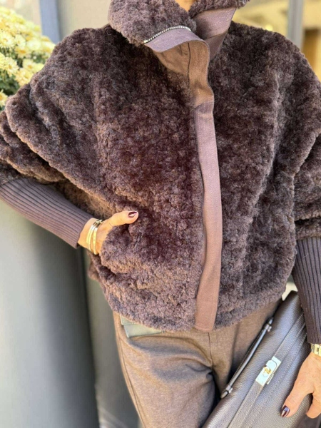 Късо палто от еко косъм в кафяв цвят с метален цип висока яка и реглан ръкави. Универсален размер.