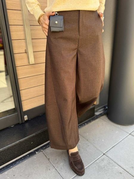 Панталон в кафяв цвят с модерна кройка. Моделът е с обемни крачоли, цип и копче за закопчаване и странични джобове.
