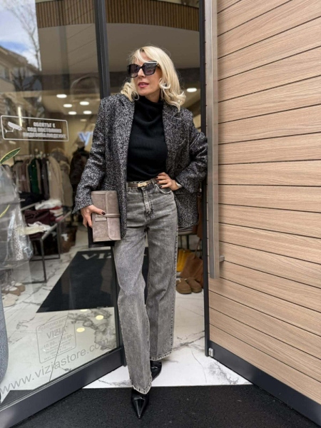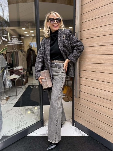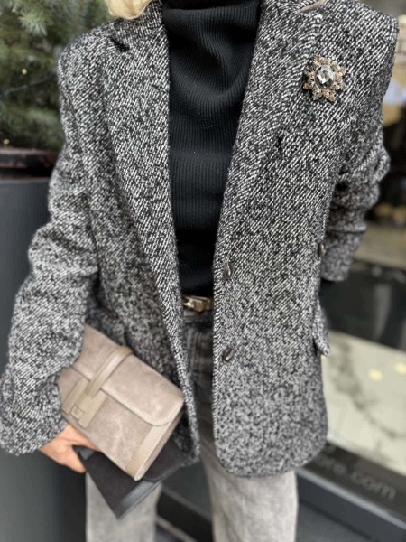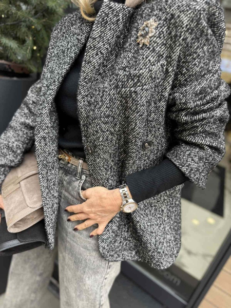 Късо палто от плътна зимна материя с ревери, закопчаване с копчета и предни джобове. Към палтото има аксесоар брошка.  Универсален размер.