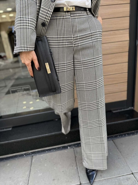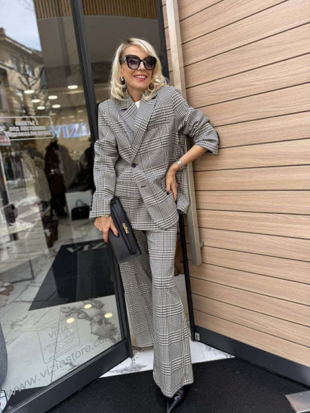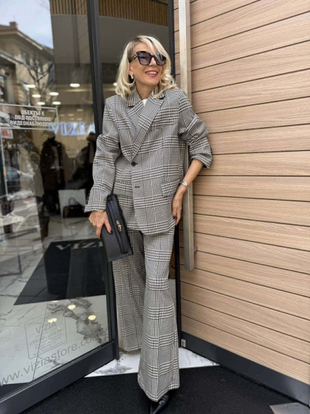 Костюм сако и панталон с пепитен десен. Сакото е oversize кройка с двойно закопчаване може да се носи свободно и вталено. Панталонът е с прави и свободни крачоли. Закопчаване с цип и копче.