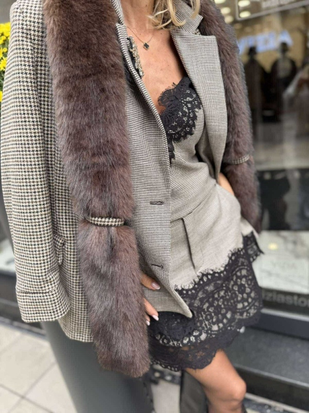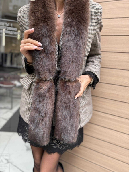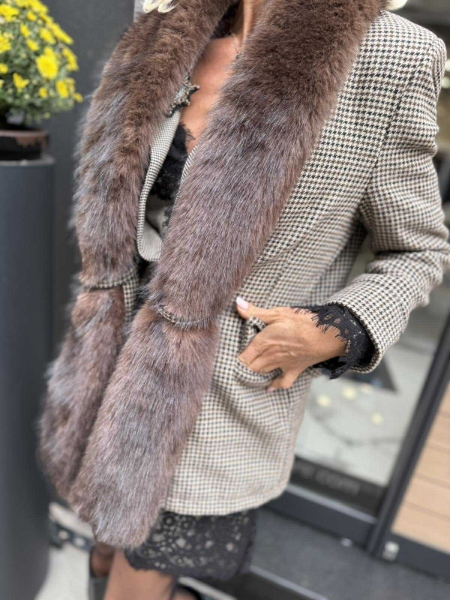Палто от плътна зимна материя с пепитен десен. Моделът е свободен с яка от еко косъм, която може да се сваля. Прибира се с връзки.  Универсален размер.
