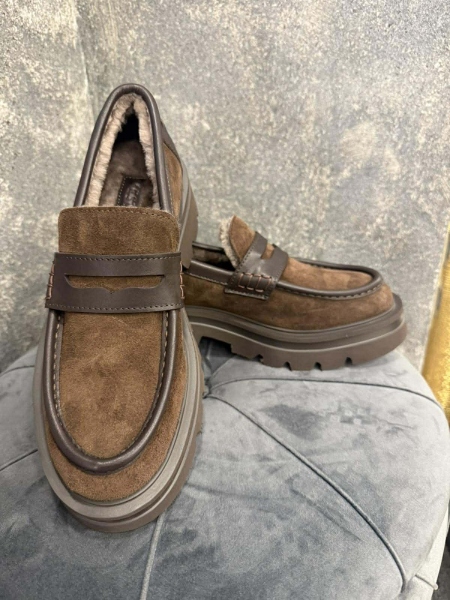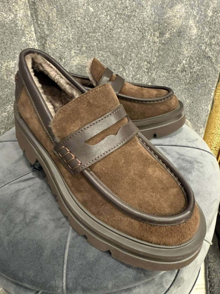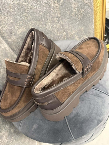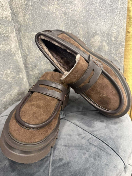 Лоуфъри от естествена кожа в кафяв цвят с дебела и равна подметка. Моделът е заоблен в предната част. Вътрешната част е декорирана с естествен косъм.