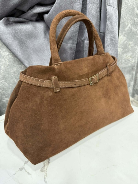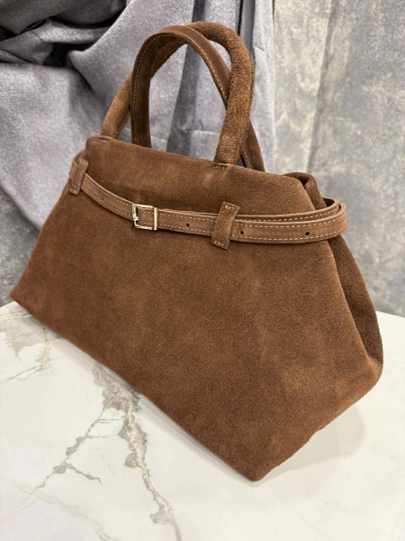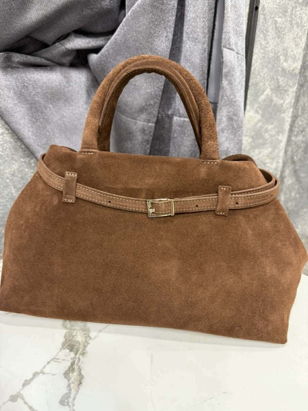 Чанта в  светло кафяв цвят от естествен велур с две къси дръжки, една дълга с възможност за сваляне, една преграда и закопчаване с цип.