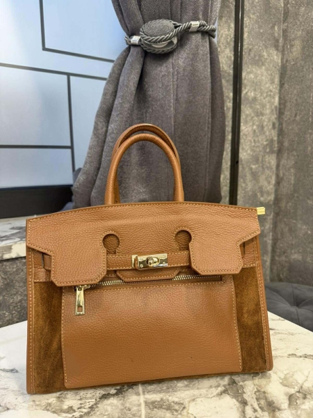 Малка чанта в светло кафяв цвят от естествен велур и естествена кожа. Моделът е с две къси дръжки, една дълга с възможност за сваляне и закопчаване с метален цип.