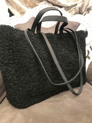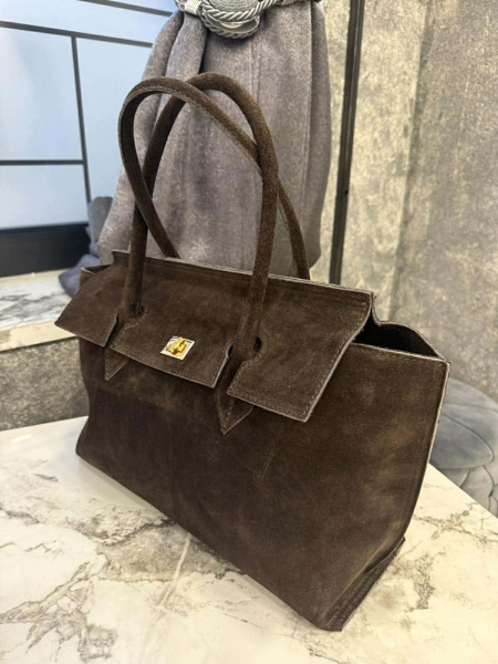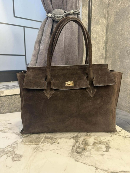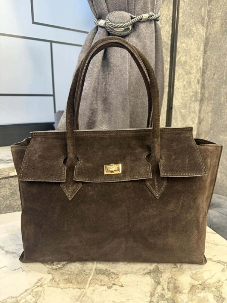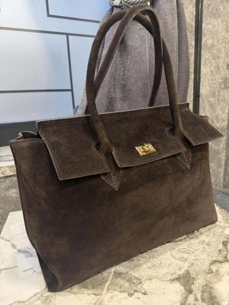 Чанта в тъмно кафяв цвят от естествен велур с две къси дръжки, една дълга с възможност за сваляне, метален цип и една преграда.
