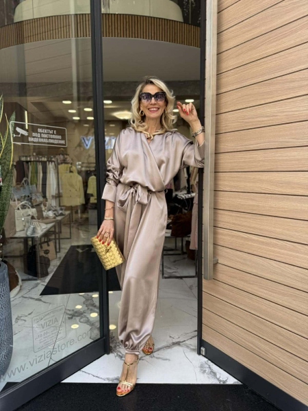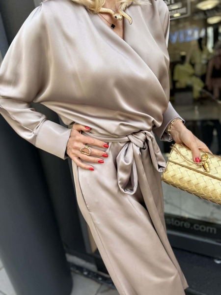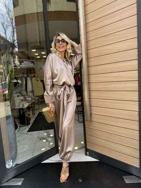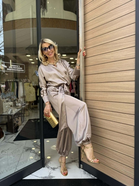 Гащеризон от сатенирана материя в бежов цвят с прехвърлено деколте, ластик на талията и широки крачоли с възможност за стесняване в долната част. Към моделът има колан от сатенена материя за вталяване и аксесоар колие.
