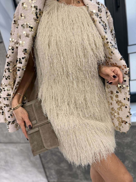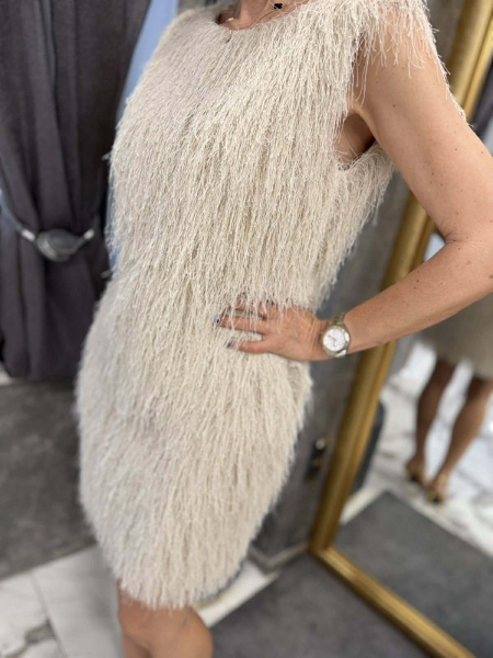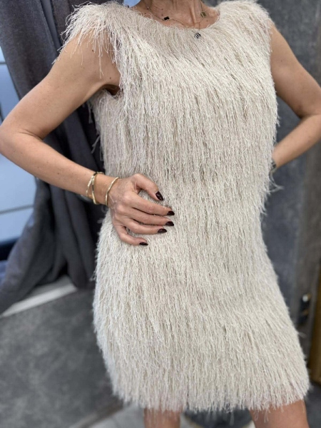 Къса рокля в бежов цвят със златисти нишки и бежови реси. Моделът е с права кройка, без цип и има изрязан гръб.