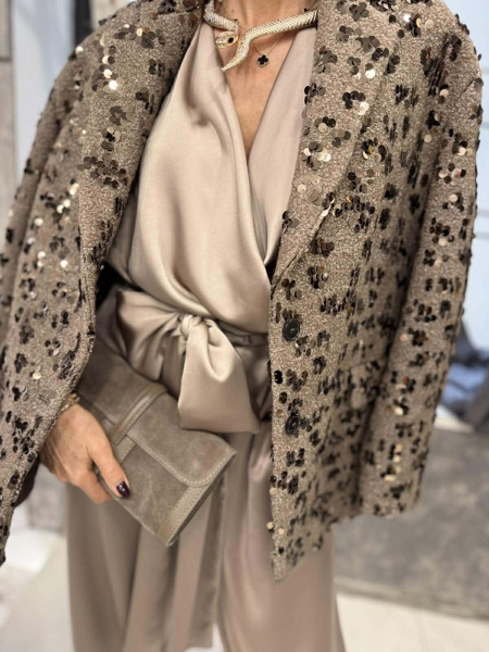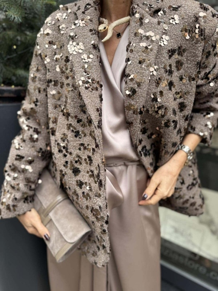 Палто oversize модел в тъмно бежов цвят със златисти пайети. Моделът е с ревери и закопчаване с копчета. Универсален размер подходящ за M, L, XL.