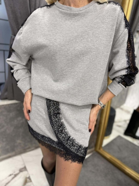 Комплект блуза и пола от трико с декорация от дантела. Горната част е блуза със свободен силует. Полата е mini и се закопчва със страничен цип.
