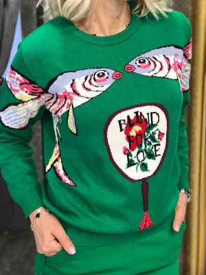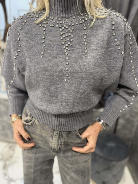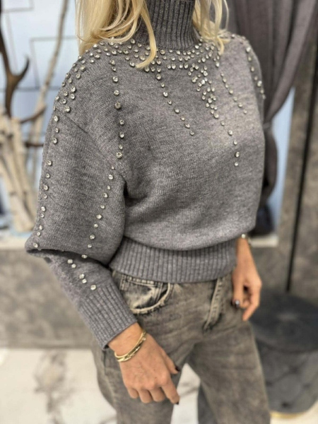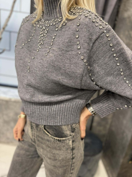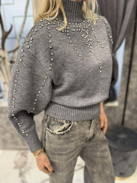 Пуловер от фино плетиво в сив цвят с декорация от камъчета. Универсален размер.