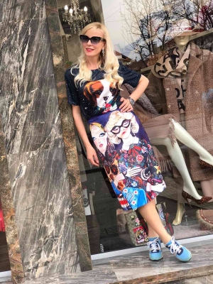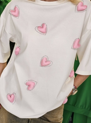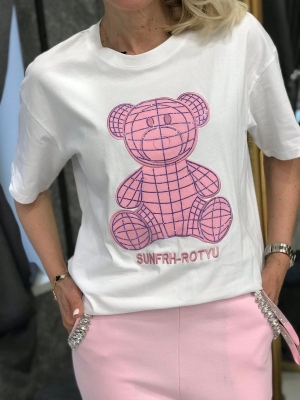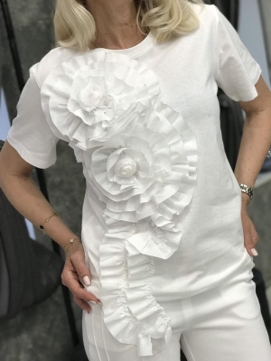 Тениска в бял цвят от трико с цветна щампа. Универсален размер.