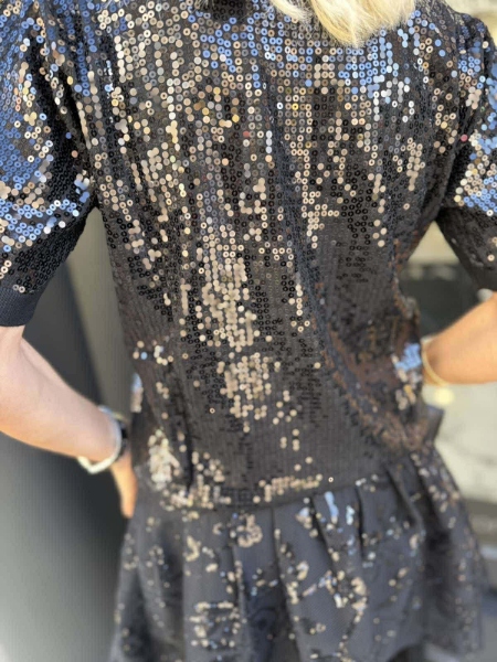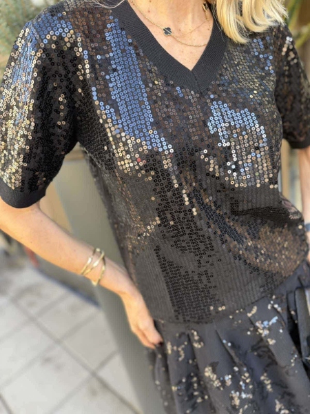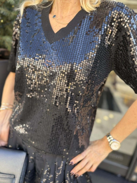 Блуза с остро деколте фино плетиво с декорация от пайети.