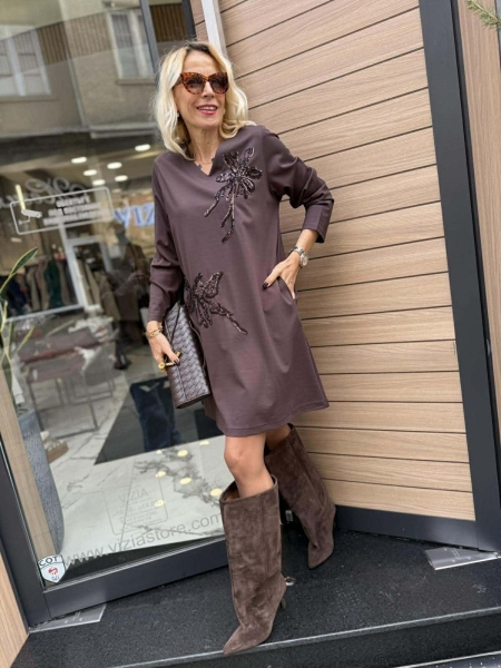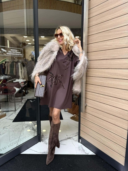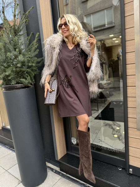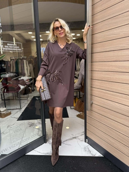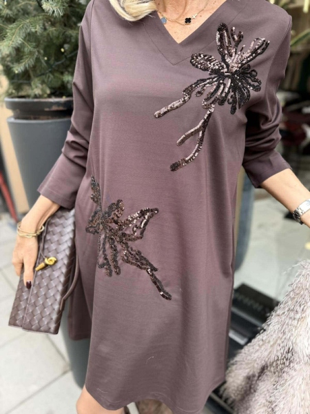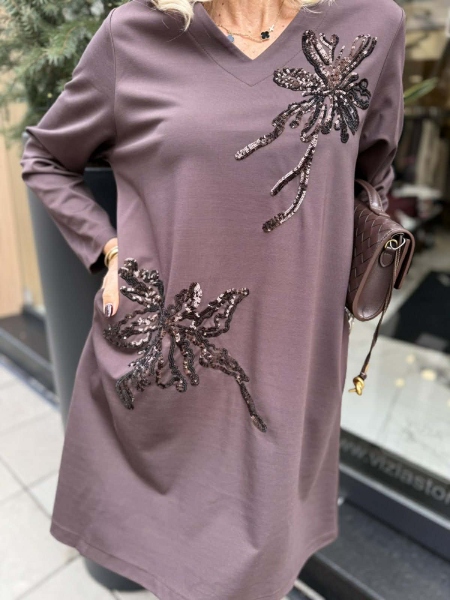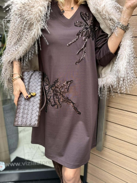 Къса рокля от трико в кафяв цвят с декорация от пайети. Моделът е със свободна кройка и има странични джобове. Универсален размер.