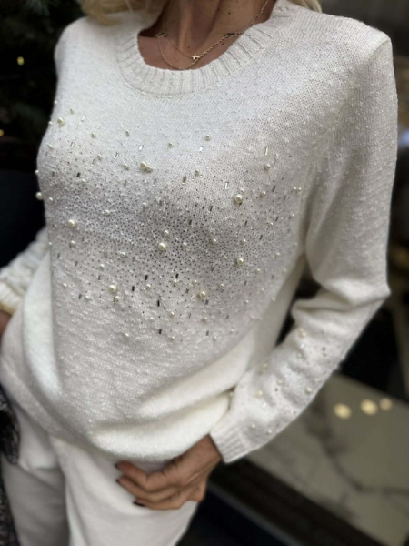 Пуловер в бял цвят с декорация от перли и камтчета. Моделът е със свободна кройка. Универсален размер.