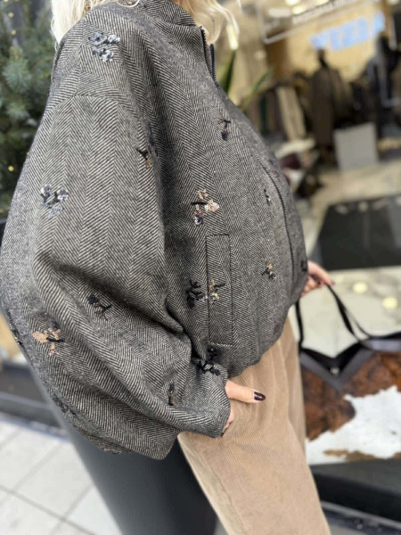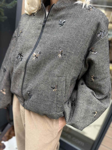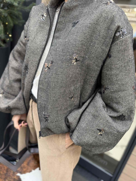 Късо яке тип бомбър от плътна зимна материя. Моделът е с обемни ръкави, капитонирана подплата и закопчаване с цип. Универсален размер.