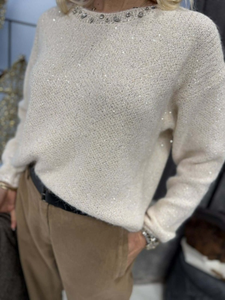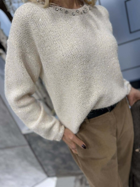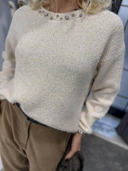 Пуловер в светло бежов цвят от фино плетиво със свободна кройка. Универсален размер.
