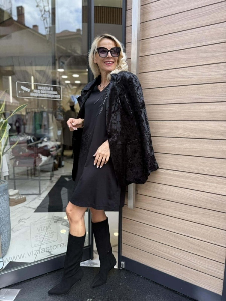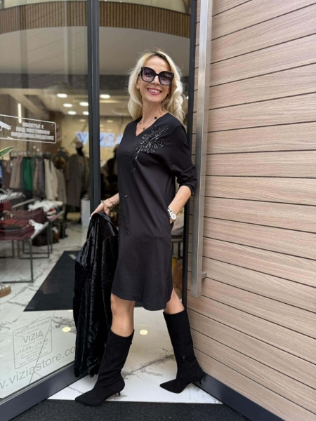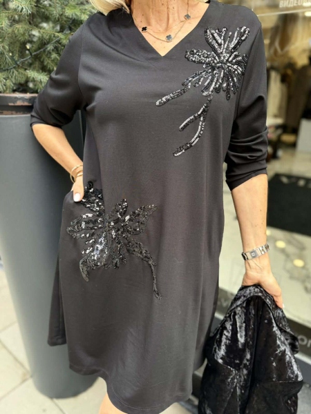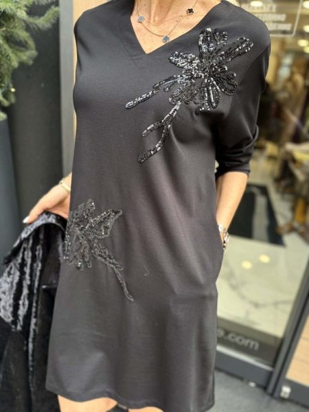 Къса рокля от трико в черен цвят с декорация от пайети. Моделът е със свободна кройка и има странични джобове. Универсален размер.