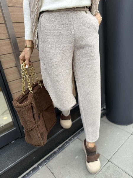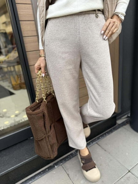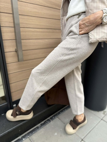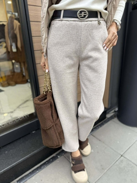 Панталон от плътна материя в бежов цвят с аксесоар колан. Моделът е със стесняващи се крачоли и ластик на талията.
