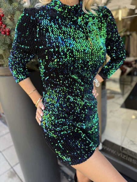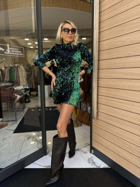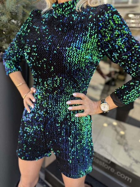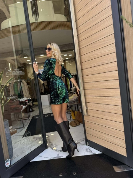 Гащеризон с къси панталони изцяло декориран със зелени пайети. Моделът се закопчава с цип и има изрязан гръб.