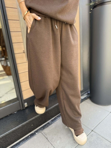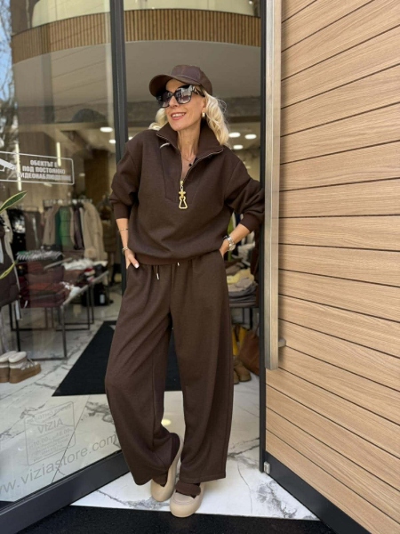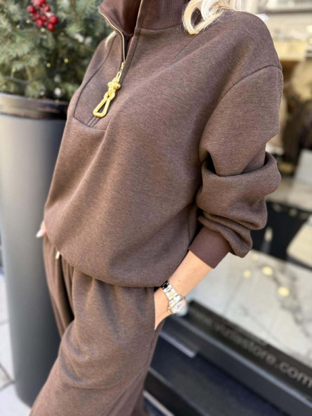 Комплект суитчер и панталон в кафяв цвят от плътно трико. Горната част е oversize с висока яка и златиста закопчалка. Панталонът е с широки обемни крачоли и ластик на талията.