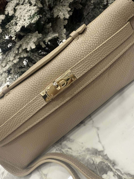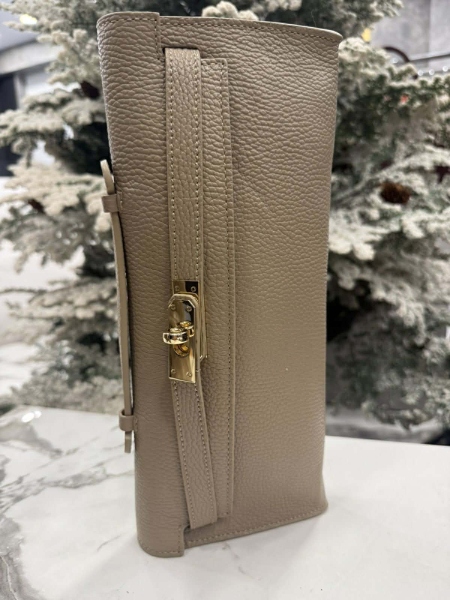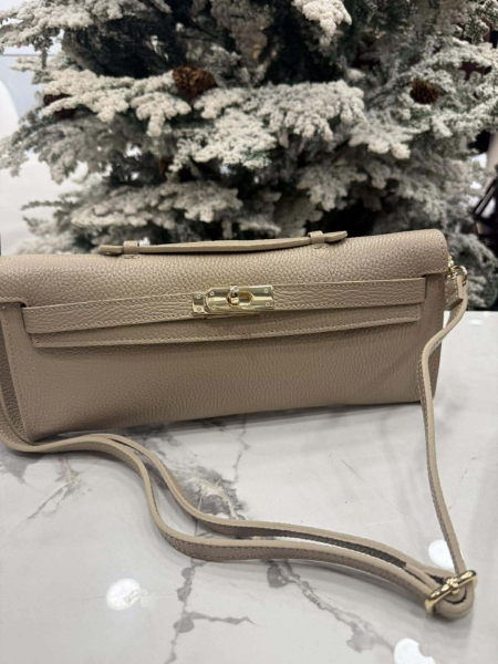 Чанта тип клъч от естествена кожа в бежов цвят. Моделът е с къса дръжка и една дълга, която може да се сваля.