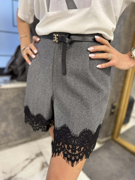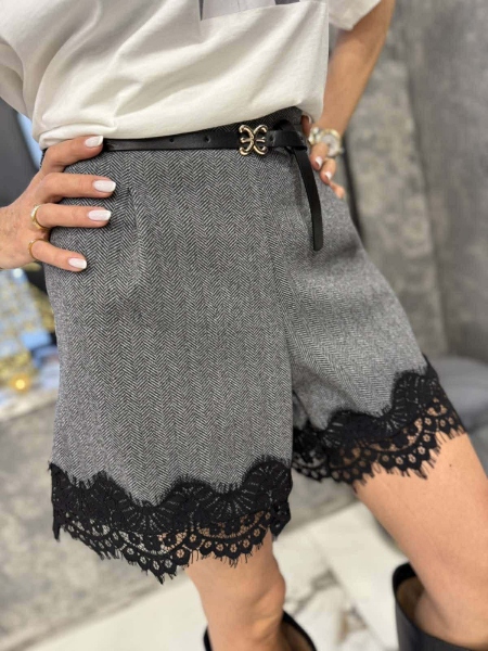 Къси панталони от зимна материя с декорация от черна дантела. Моделът е с ластик на талията и аксесоар коланче.
