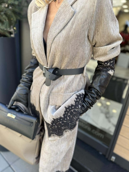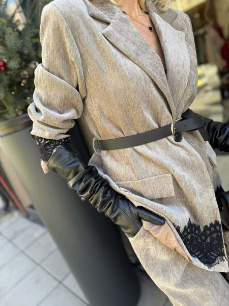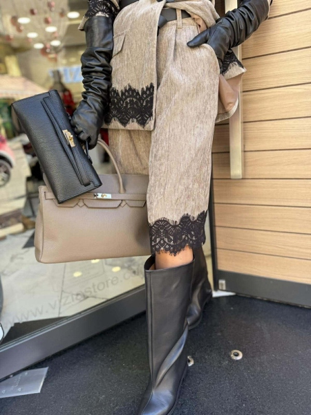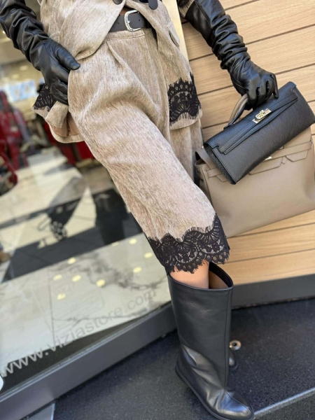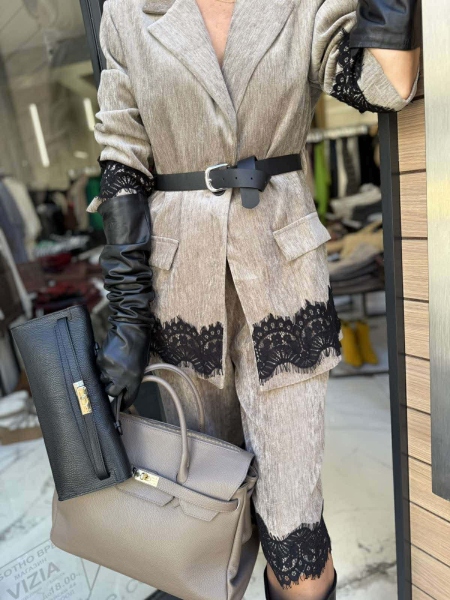 Комплект сако и панталон в бежов цвят с декорация от черна дантела. Сакото е със свободна кройка, ревери и закопчаване с копче. Панталонът е с ластик на талията, дължина около коляното и аксесоар коланче.