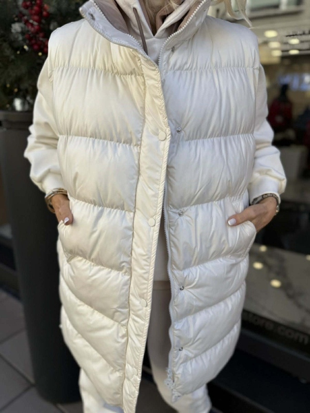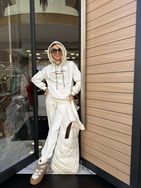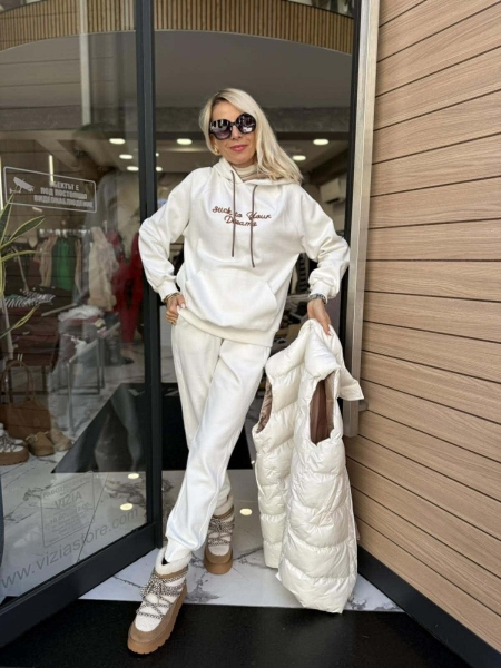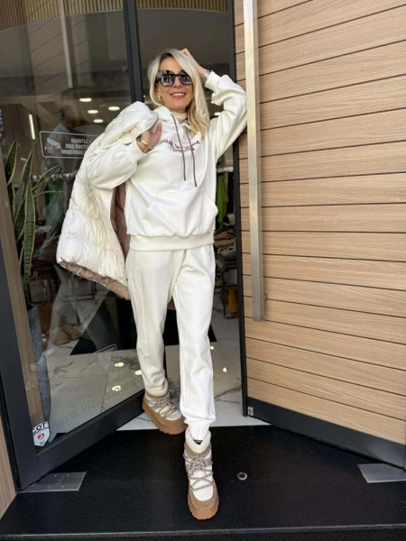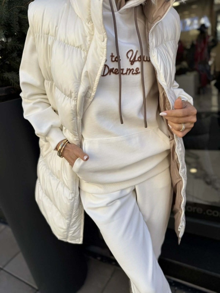Комплект от три части в бял цвят. Елекът е със свободна кройка и се закопчава с цип и копчета. Суитчерът е със свободна кройка, качулка и няма закопчаване. Панталонът е с прави крачоли и ластик на талията и в долната част.