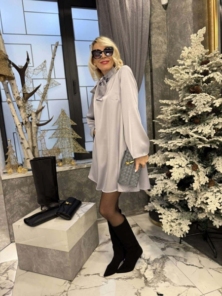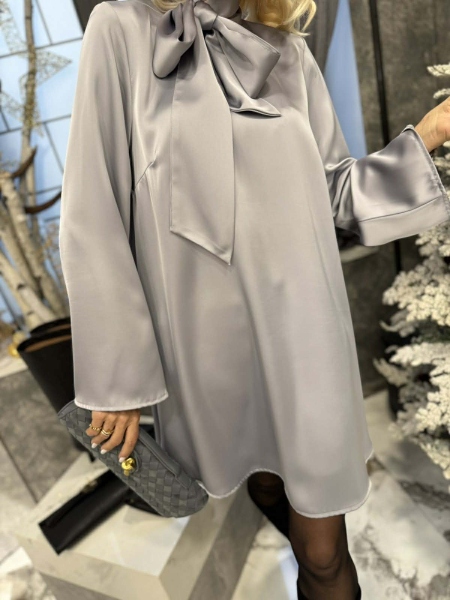 Къса рокля в сиво- сребрист цвят от сатенирана материя. Моделът е с свободна кройка, изрязан гръб и шал яка.