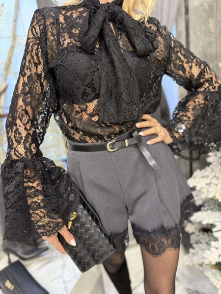 Къси панталони от в сив цвят с декорация от черна дантела. Моделът е с ластик на талията и аксесоар коланче.