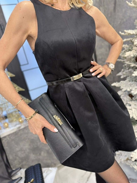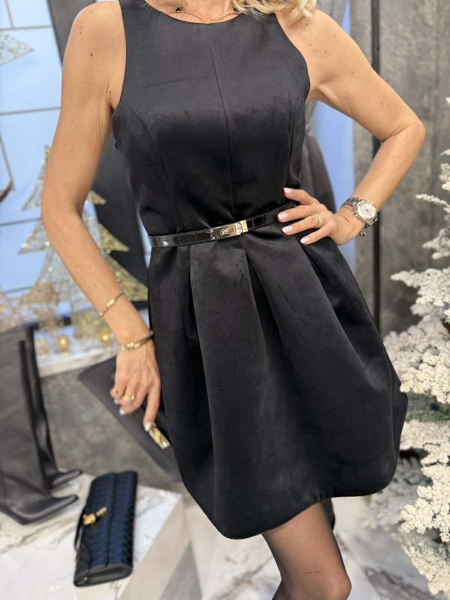Къса рокля от черно кадифе с вталена горна част и разкроена пола. Моделът се закопчава с цип.