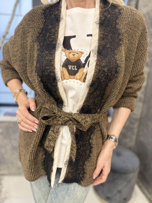 Жилетка с издължен силует и свободна кройка с декорация от реси. Моделът се закопчава с копчета.