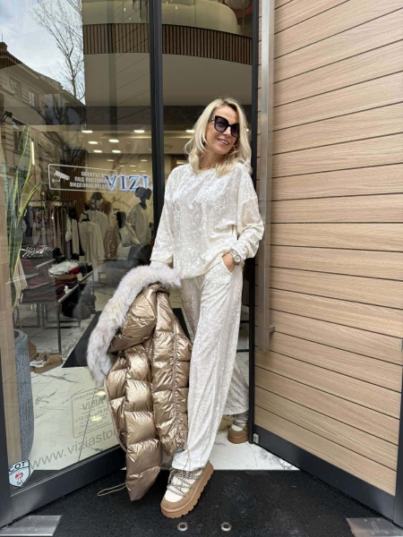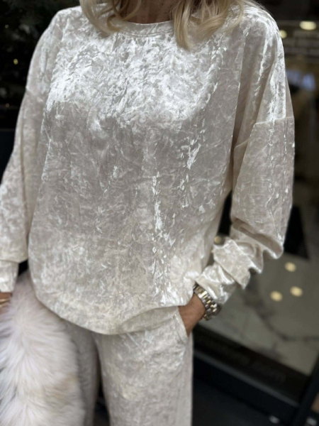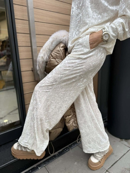 Комплект от блуза и панталон от плюш в цвят екрю. Блузата е с напълно свободен силует и завършва с ластик. Панталонът е с широки крачоли и ластик в талията.