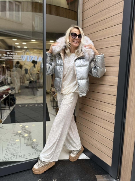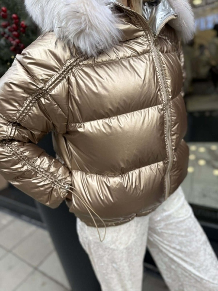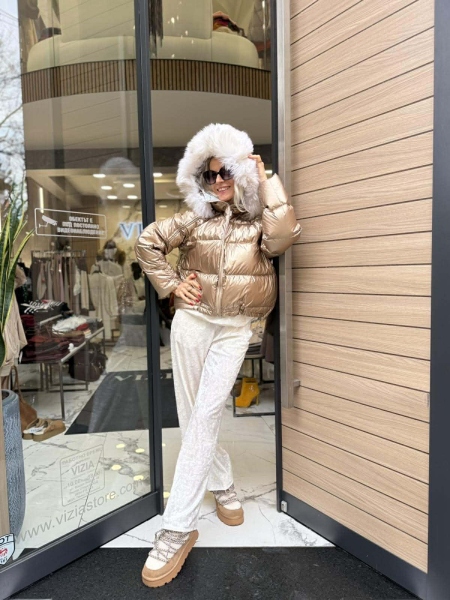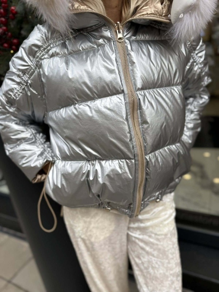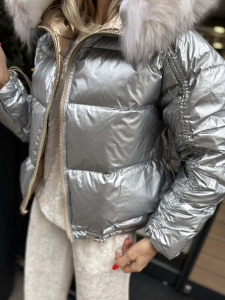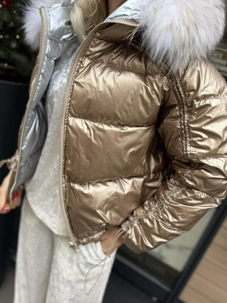 Яке от шушлякова материя с две лица, закопчаване с цип и качулка с яка от естествен косъм. Моделът е с пълнеж от естествен пух. Универсален размер подходящ за S, M, L.