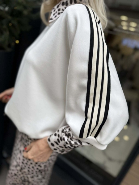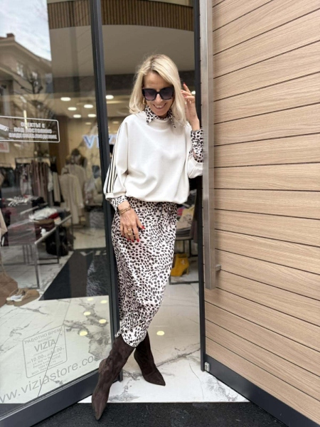 Комплект риза с пола и блуза от трико. Ризата е от сатенирана материя с права кройка. Полата е от сатенирана материя с миди дължина и ластик на талията. Блузата е трико със свободна кройка и има връзка в долната част.