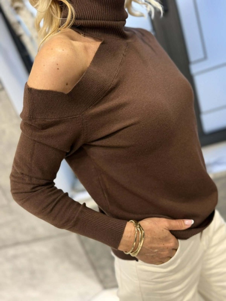 Поло от фино плетиво в кафяв цвят със свободна кройка. Моделът е универсален размер подходящ за M, L, XL. Бюст- 104 см Дължина- 57 см Състав: 55% вискоза, 35% полиестер, 10% еластан. Произведено в Италия.