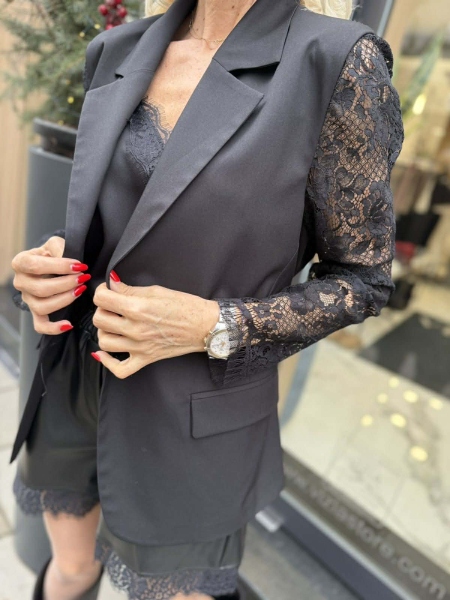 Сако в черен цвят с декорация от дантела. Моделът е със свободна кройка и има възможност за стесняване.