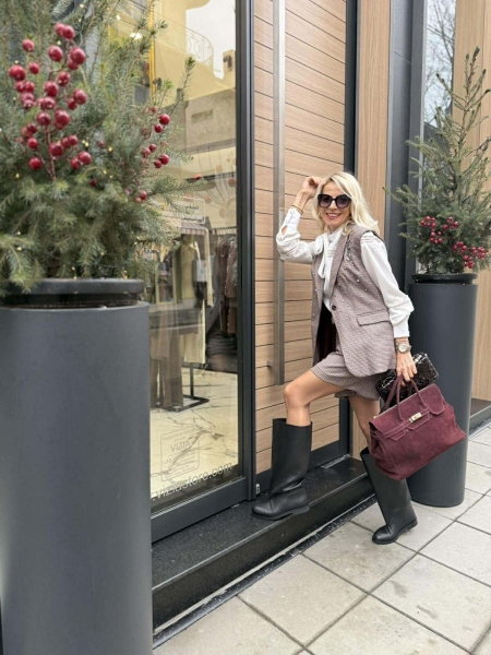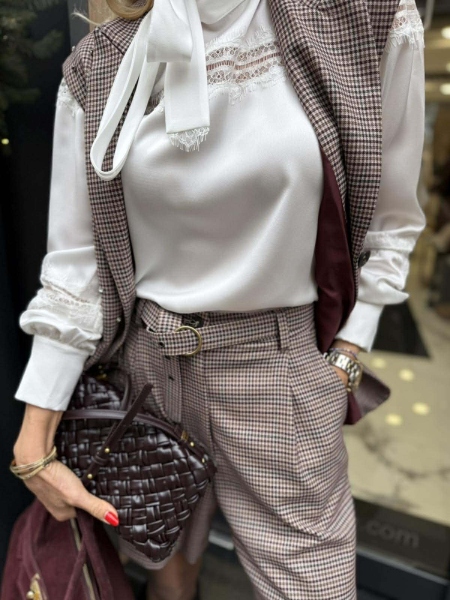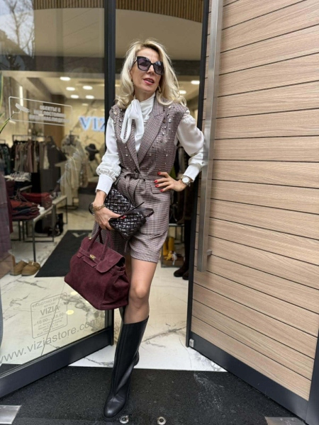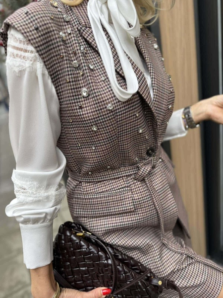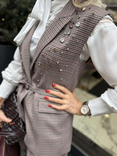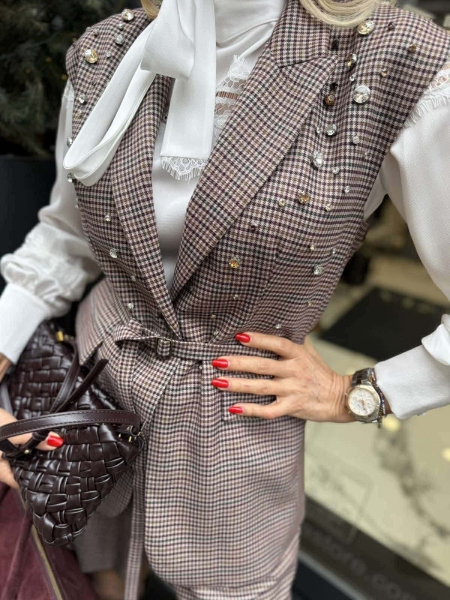 Комплект елек и къси панталонки в пепитен десен. Елекът е втален с ревери, закопчаване с копче и аксесоар колан за талията. Панталонките са със свободни крачоли с басти, закопчаване с цип и копче и колан на талията.